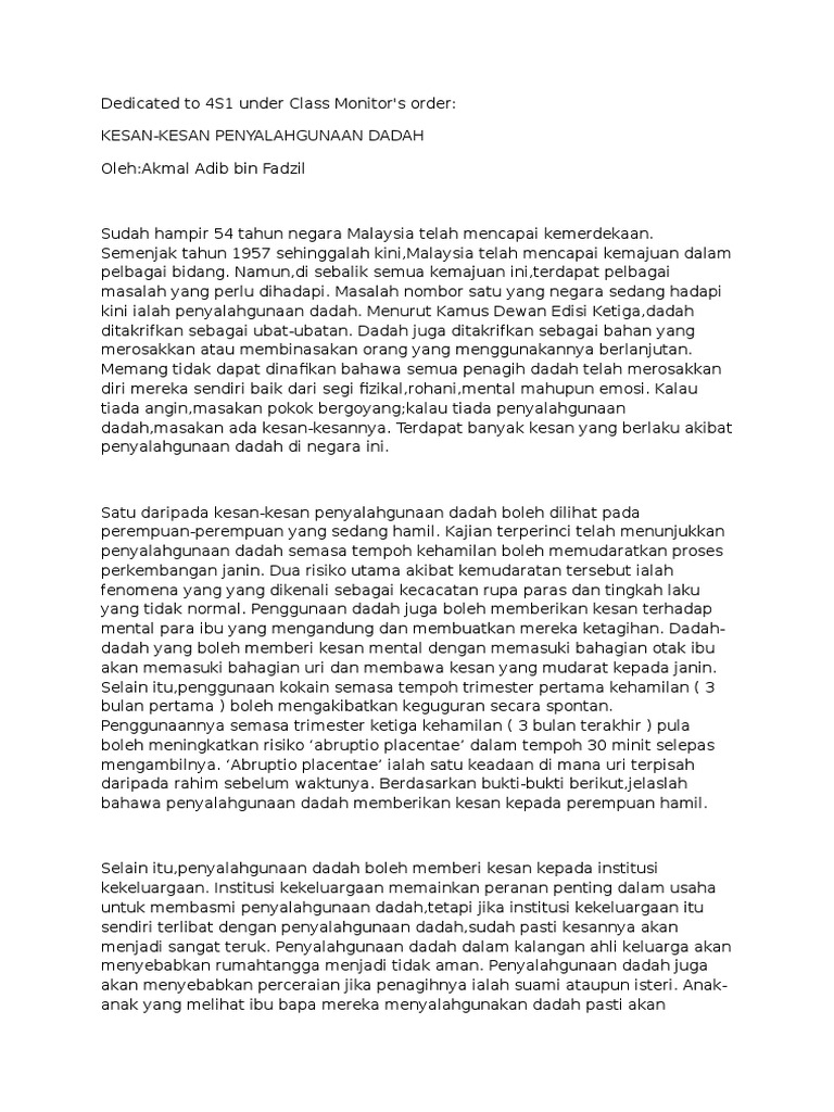1) pengenalan tidak dapat dinafikan bahawa masalah penagihan dadah sedang mengancam kehidupan manusia khasnya sesungguhnya masalah ini mendatangkan kesan yang buruk kepada individu itu sendiri, keluarga, masyarakat, ekonomi dan keselamatan negara. Terdapat banyak keluarga yang jadi cerai berai disebabkan oleh kesan penyalahgunaan dadah dan ketagihan. Gejala dadah membawa pelbagai kos dan kesan buruk kepada negara. Pokok ketum ialah sejenis tumbuhan daripada keluarga rubiaceae yang banyak terdapat di afrika, di utara dan tengah semenanjung malaysia serta di selatan thailand. 8 dadah dan kesannya kepada sosial hilang minat dan tidak mempedulikan tanggungjawab terhadap pekerjaan,keluarga serta masyarakat sekeliling maruah dan nama baik keluarga tercemar dalam kalangan masyarakat prestasi dan disiplin kerja merosot,tingkah laku dan sikap berubah daripada. Kesan dadah kepada keluarga dan kesihatan. Selamat datang di villa saya yang yaaahhh tidak gede gede amatlah sambut pak arso kepada keluarga haris waaahh gede begini pakk. Penyalahgunaan dadah dalam kalangan ahli keluarga akan menyebabkan rumahtangga menjadi tidak aman. Diri penagih boleh menjadi beban kepada keluarga kerana terpaksa menghabiskan masa, tenaga dan wang yang banyak untuk merawatnya. Waktu demi waktu terus berjalan hingga siang tiba. Harapan ibu bapa ke atas anak menjadi musnah. Nah daripada kamu membuat pesan kesan yang sekedar begitu saja, bukankah lebih baik jika kalimat kesan dan pesanmu nantinya bisa bermanfaat? Bayu ayo dadah sm ayah.dadah.