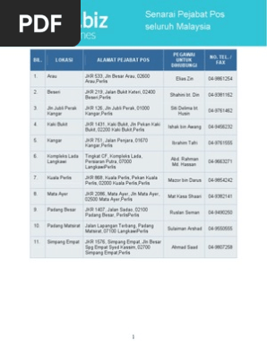 Senarai Pejabat Pos Malaysia from imgv2-1-f.scribdassets.com Telefon balai polis lubok stol polis diraja malaysia 17200 pasir mas kelantan. Makluman kepada semua pelanggan yang dihormati. Lisateavet pejabat pos pasir mas kohta leiate veebisaidilt www.pos.com.my. Jkr 411 jalan pejabat jajahan ✉ 17000. �antara usaha terbaru dilaksanakan termasuk membina wisma pasir mas yang menempatkan ruang perniagaan dan pejabat yang mana kini bangunan wisma pasir mas sebelum ini dirasmikan sultan kelantan. Pasir mas district is a district (jajahan) in kelantan, malaysia. Untuk mengetahui senarai tugas atau perkhidmatan yang dibekalkan oleh pejabat tanah dan jajahan pasir mas, sila kunjungi laman web: Pejabat pos, pasir mas coordinate: