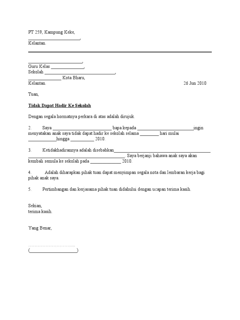 Anak saya tidak dapat hadir ke sekolah pada tarikh berkenaan kerana perlu bersama keluarga menghadiri majlis perkahwinan abangnya di johor/ada pembacaan wasiat keluarga/ada konflik keluarga/ada urusan yang agak privasi berkaitan keluarga yang perlu diselesaikan. Surat tidak hadir sekolah via www.scribd.com. Setiap perenggan tersebut mestilah dimulakan dengan penomboran bermula. Dengan segala hormatnya perkara di atas adalah dirujuk. Kami sekeluarga diarah oleh kementerian kesihatan malaysia untuk menjalani. Ini sangat penting kerana tutor dikehendaki memasukkan kehadiran secara online selepas sahaja sesi kuliah tamat. Sekiranya anak tidak dapat hadir kesekolah, ibubapa hendaklah menghantar surat rasmi tidak hadir ke sekolah atau surat tunjuk sebab sebagai bukti kepada guru kelas dan juga guru besar. Maka, boleh gunakan contoh surat tidak hadir ke sekolah kerana sakit ini. Oleh karena surat izin ini digolongkan ke dalam surat resmi, maka tentu saja formatnya harus mengikuti penulisan surat resmi pada umumnya. Dari pasal 463 bw kita dapat mengetahui bahwa keadaan tidak hadir terdiri dari beberapa unsur, yaitu: Contoh surat rasmi pemberitahuan tidak hadir bekerja. Isu uum saman raja petra dan suara keadilan rm7 juta via muhtarsuhaili.wordpress.com. Dengan itu, saya sertakan sekali.