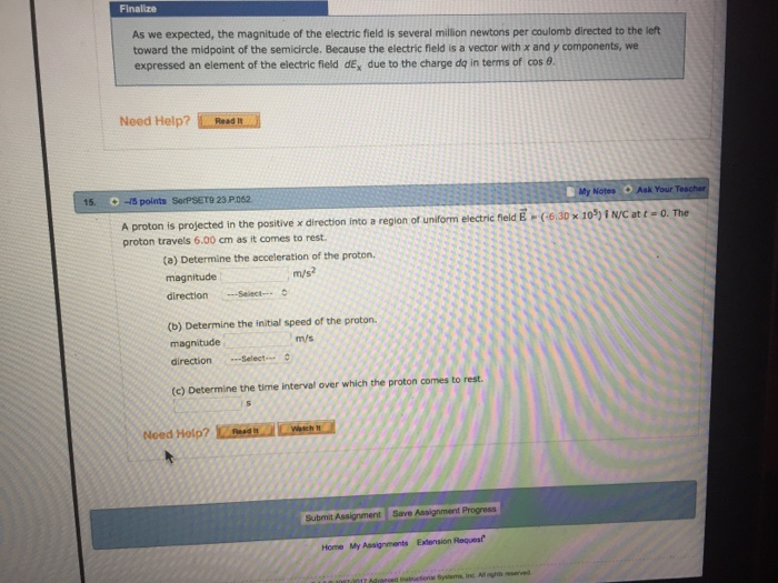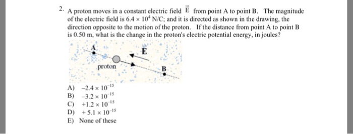 Solved: A Proton Is Acted On By An Uniform Electric Field ... from d2vlcm61l7u1fs.cloudfront.net A proton is moving in an electric field. Check spelling or type a new query. Maybe you would like to learn more about one of these? We did not find results for: The direction of the acceleration of the proton is.